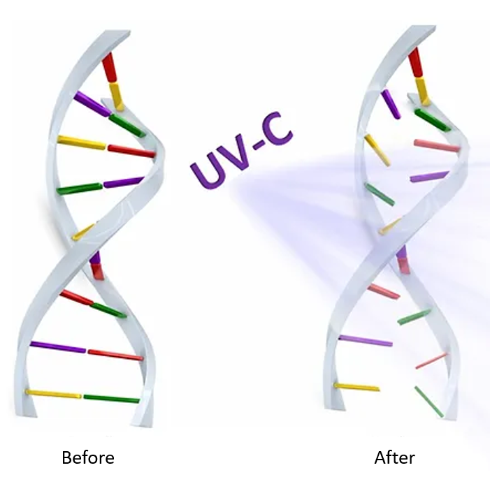 - UV-C disinfects by breaking the chains of RNA inside of pathogens, thereby making them incapable of reproducing.
